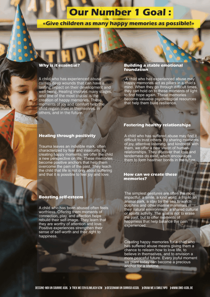Through “Dessine-moi un sourire”, everyone can, in their own way, reach out to a child broken by abuse. Whether it’s through a donation, a legacy gift, organizing a fundraiser, a solidarity purchase, or simply sharing our message with those around you, every action—no matter how small—can become a spark of hope.