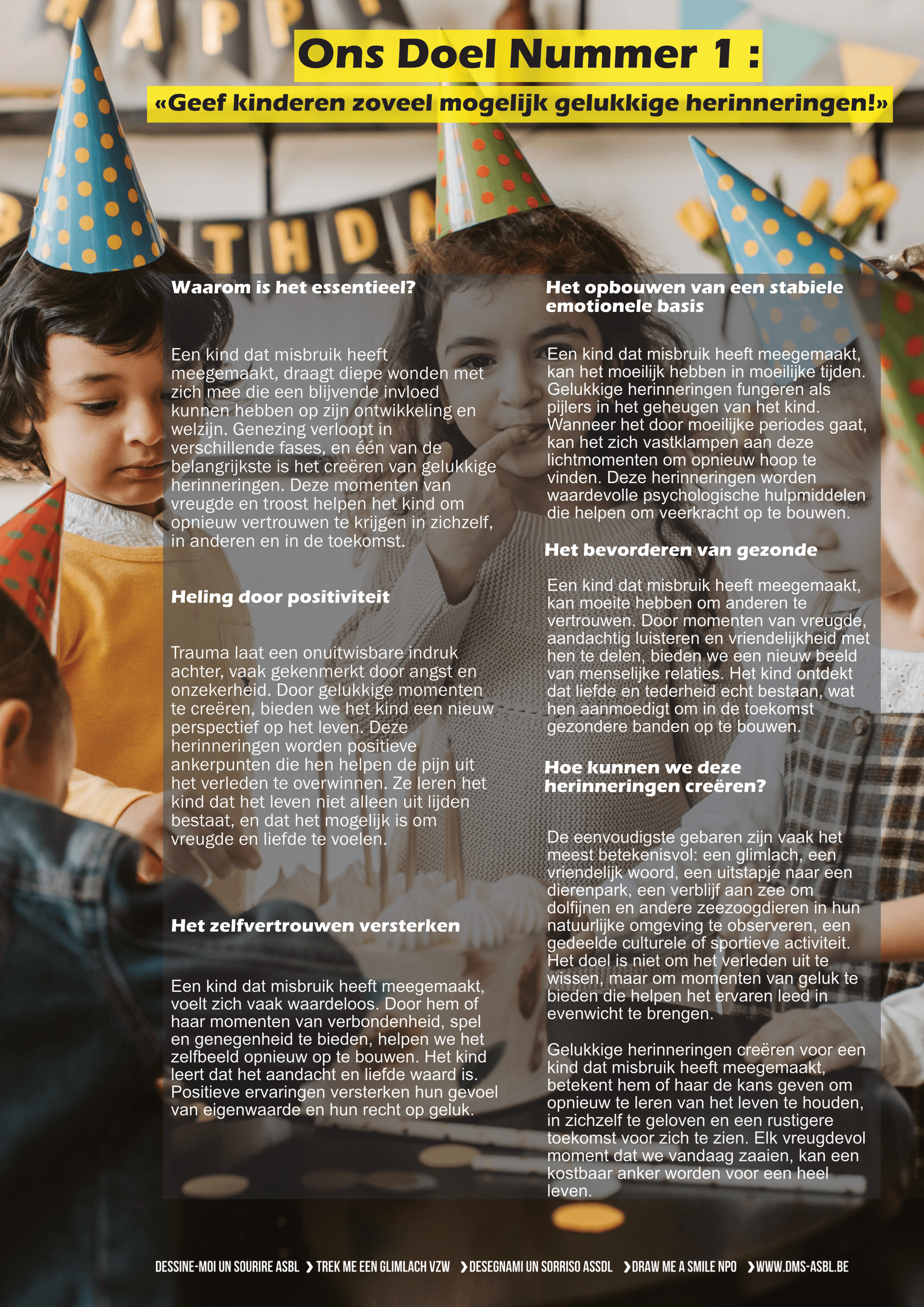 Via «Dessine-moi un sourire» kan iedereen op zijn of haar manier een hand reiken naar een kind dat gebroken is door misbruik. Of het nu gaat om een gift, een schenking, een legaat, het opzetten van een inzamelactie, een solidaire aankoop of gewoon het verspreiden van onze boodschap in je omgeving — elke actie, hoe klein ook, kan een vonk van hoop worden.