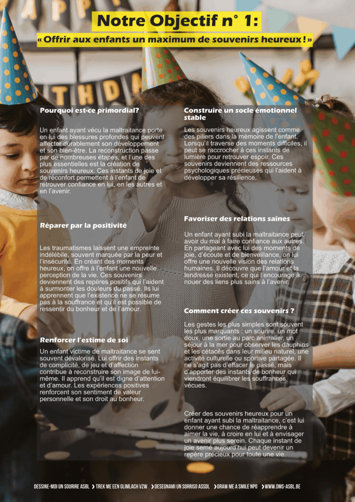 À travers «Dessine-moi un sourire» , chacun peut, à sa façon, tendre la main à un enfant brisé par l’abus. Que ce soit par un don, une donation, un legs, la création d’une collecte, un achat solidaire ou simplement en relayant nos messages autour de vous, chaque action, aussi petite soit-elle, peut devenir une étincelle d’espoir. Parce qu’au-delà des mots, ce sont vos gestes qui reconstruisent… et redonnent à ces enfants le droit de sourire à nouveau.