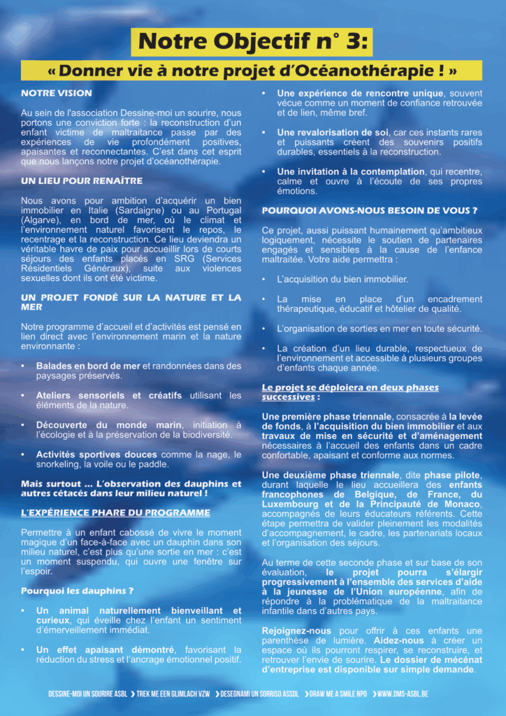 À travers «Dessine-moi un sourire» , chacun peut, à sa façon, tendre la main à un enfant brisé par l’abus. Que ce soit par un don, une donation, un legs, la création d’une collecte, un achat solidaire ou simplement en relayant nos messages autour de vous, chaque action, aussi petite soit-elle, peut devenir une étincelle d’espoir. Parce qu’au-delà des mots, ce sont vos gestes qui reconstruisent… et redonnent à ces enfants le droit de sourire à nouveau.